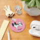 Destei's original cartoon illustration of a black and white coat color Papillon breed dog on a pink background color with a pattern of hearts in different sizes. There is also a personalizable text area for a name.