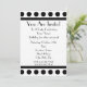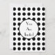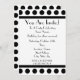 A simple invitation with a black and white polka dot design across top and bottom of front. Black trim and black Parisian font. Customize with details of your occasion. Opposite side features solid design with a circle shape in the middle, framing text.