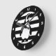 Striking wall clock with penguin design on bold black and white stripes.