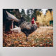 Featuring a large black and white rooster hanging around the farm with his two white hen friends. Nothing like scrounging around for some bugs on a cool autumn day with colorful leaves cascading down to the ground in an amazing display.