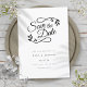 This simple black and white save the date card features a pretty script save the date with a leaf motif, set above your details in an elegant modern text.