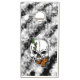 Black, white and orange skull with a butterfly popping out of the sockets.