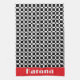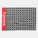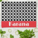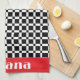 Large and small black squares on a white background make a modern and stylish kitchen towel. If you like minimalist décor, you will love this! Personalize with your name in a bright red band at the bottom.