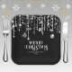Black and white string lights sparkles Christmas party paper plates with a cute whimsical fun party invitation for a festive Holiday party.