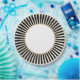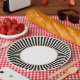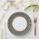This paper plate features a black and white radial stripe around the edge with a white center and a gold border. Perfect for New Years Eve or any other formal gathering.