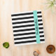 Modern binder featuring a pattern och black and white, horizontal stripes. Across the front is an aqua blue band with customizable text. Add a name or other text. Stylish and fun design for women.