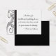 Practice some wedding kindness when you arrange a donation card at your guests' marriage reception place setting. The elegant Black and White Swirls Wedding Charity Favor Card states that in lieu of a traditional party favor, a donation has been made in their name to charity. Customize it by adding the name of the favorite charity and the personal names of the bride and groom. This classy custom wedding charity card features a black and white swirly design.