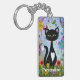A black and white tuxedo cat with pretty green eyes, pink ears and wearing a red collar. She is sitting in a garden of green grass and pretty colorful flowers on a bright summers day. Around her are floating leaves and fluttering butterflies. At the bottom of the keychain in white lettering is a template to add your name or other text.