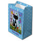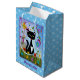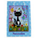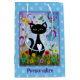 A black and white tuxedo cat with pretty green eyes, pink ears and wearing a red collar. She is sitting in a garden of green grass and pretty colorful flowers on a bright summers day. Around her are floating leaves and fluttering butterflies. This digital art piece is finished with a purple border. The background color is blue and has a pattern of tiny white paw prints. Below the picture is a template in a dark blue text to add your name or message to personalize this pretty gift bag.