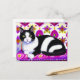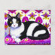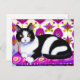 Postcard in an illustration of a black and white tuxedo cat on a cushion, with an exotic, patterned background in shades of magenta and purple