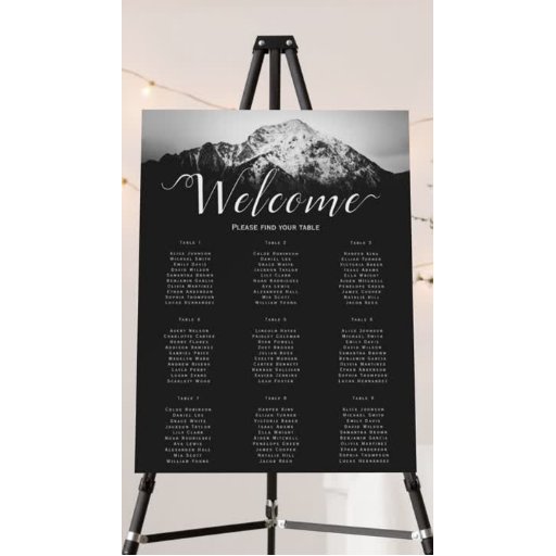 Black and white wedding under the mountains. Landscape photograph of a snow covered mountain with darkness below and white cloudy sky above. Names of the couple are in black font above the mountain in the sky and all the details are in white font below the mountain. Completely customizable and personalizable wedding products.