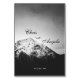 Black and white wedding under the mountains. Landscape photograph of a snow covered mountain with darkness below and white cloudy sky above. Names of the couple are in black font above the mountain in the sky and all the details are in white font below the mountain. Completely customizable and personalizable wedding products.