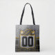 Get game-day ready in bold style with this custom all-over print tote bag featuring white, black and yellow gold plaid with silver-white faux glitter accents. Perfect for fans, cheer squads, football parents, or anyone repping team colors with glitter glam. A glittery silver-black football shield design and jersey-style number template gives this sporty tote a spirited edge. Personalize with your favorite player's number for the ultimate custom school or fan gear—carry your team pride everywhere!
