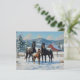 A beautiful black appaloosa horse family in the snow in a pasture on a farm. A scenic winter landscape behind them includes a red barn, trees, and hills.