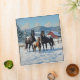 A beautiful black appaloosa horse family in the snow in a pasture on a farm. A scenic winter landscape behind them includes a red barn, trees, and hills.