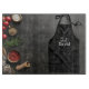 This professional-looking Black Apron cutting board is perfect for any person who loves to cook, bake, or BBQ. A professional black apron on a black background with kitchen items throughout.