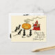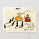 Funny, vintage Halloween illustration of a witch in red informing a jack-o-lantern and five black cats that "Class in the Black-Art will meet on Halloween!"