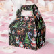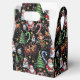 Christmas-themed pattern featuring Santa Claus, reindeer, snowmen, elves, Christmas trees, candy canes, and snowflakes on a black background