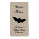 An eerie black bat on a burlap background, decorates this personalized wine, beer or drink label for Halloween.