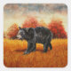 A cute black Bear taking a stroll through a field of bright fall colored foliage.