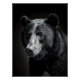 A detailed black and white image captures a bear with strikingly fur and expressive eyes. The dark background contrasts with the bear's highlighted features, enhancing its presence.