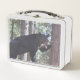 This is a standard metal lunchbox that appears to work just fine. We designed this box ourselves with an uploaded photo and custom text on the front and back. It looks absolutely beautiful except the front of the lunchbox is not centered like it shows in the photo. The print borders don't align with the inset flat part of the box where the preview photo online showed it perfectly centered in there. The back looks nice and centered though.