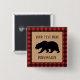 In the center is a silhouette of a black bear with text templates above and below in black lettering so you can personalize. this image and text is inside a burlap square with a black border. The background pattern is a lumberjack red and black buffalo plaid.