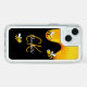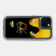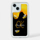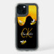 A stylish black background and happy smiling bumble bees. Decorated with sweet, golden honey dripping. Personalize and add your name and monogram initials, golden and white letters. The name is written with a hand lettered style script.