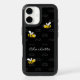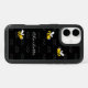 Decorated with happy, smiling yellow and black bumble bees. A chic black background. Personalize and add a name and your monogram initials, letters. The monogram is like a pattern in the background. Gray letters. The name is written with a white modern hand lettered style script