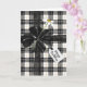 Black sheer bow with white daisy and gift tag on white and black tartan plaid pattern.