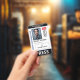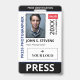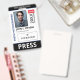 Vertical press ID with black and blue as accent colors. Add photo, logo, name, title, ID number and more.