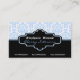 Black blue white damask interiors business card, featuring a blue and white damask pattern. The bottom part is of solid black color. A black and a blue stripe separate the two parts. Your company/name is typed on an elegant black frame with white and blue outline.