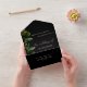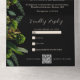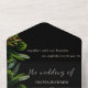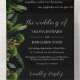 Dark moody all in one wedding design, featuring a deep emerald green woodland greenery border on a black background. With the added feature of a personalized QR Code that can be linked to your wedding website URL. Click the personalize button and add your website URL to the area provided and a brand new unique QR code will be generated on the design, that will direct your guests to your wedding website to RSVP online.
