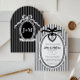 These anniversary party invitations have a black bow scalloped frame on a striped background. You can personalize with monogram letters, name and date.