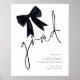 Black Bow Grad Script Welcome to Graduation Party. Available digitally and printed. This design has informal set handwriting style script for the main header, grad, and easy to personalise typography to the bottom right hand side with your details. With a stylish watercolor coquette bow illustration.