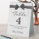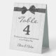Sheer black tied bow with ribbon on rustic whitewashed wood for table number tent.