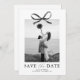These wedding save the date cards feature a modern white background, with a photo centrepiece, and a classic black watercolor bow. On the back is another photo and further details about your future wedding.
