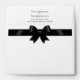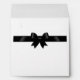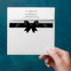A classic and formal black and white wedding invitation featuring a large black bow and ribbon against a pure white background on the back with a black frame on the front.