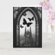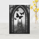 Black butterflies flutter out of an arched window, with a Gothic cathedral in the background on this beautiful, black and white birthday card.
