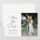 lovely white script lettering black wedding save the date wedding card. The text and colors can be edited.