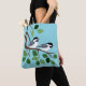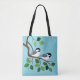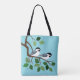 Black Capped chickadee art on tote bags with a blue background