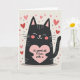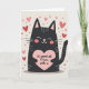 This card features a black cat in a simple graphic style, centered on an off-white background. The cat has closed eyes, rosy cheeks, and a small smile that makes it look calm and loving. It’s hugging a large pink heart with both paws, holding it close like a warm cuddle ❤️. On the heart, the message reads “i’d spend all 9 lives with u,” written in small, neat lowercase letters that are easy to read. Around the cat are several smaller hearts in shades of pink and deep red, plus a few tiny sparkle marks that add a sweet touch 💌. The color contrast between the dark cat and the soft heart tones keeps the focus on the message and the affection in the scene 🍫.