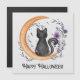 This design features a black cat sitting on a crescent moon surrounded by purple flowers and the phrase "Happy Halloween". It is perfect for a Halloween celebration.