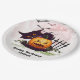 Bats in the sky fly above a scared black cat and a creepy leering jack o' lantern on these Halloween party paper plates. Fun for Halloween parties and Halloween birthday parties. MATCHING invitations in our collection.