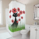 Whimsical black cat and bright red poppies shower curtain. Cat sitting in tall green grasses and red poppies. Perfect for any cat lover.