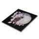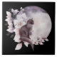 Ceramic tile with a watercolor painting of a black cat and a light purple and pink floral bouquet. Standing in front a a large full moon. Stylish and magical.