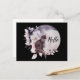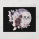 A hello postcard with a watercolor painting of a black cat and a light purple and pink floral bouquet. Standing in front a a large full moon. Stylish and magical.