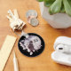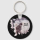 A key chain with a watercolor painting of a black cat and a light purple and pink floral bouquet. Standing in front a a large full moon. Stylish and magical.