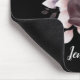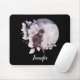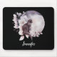 A mouse pad with a watercolor painting of a black cat and a light purple and pink floral bouquet. Standing in front a a large full moon. Stylish and magical.