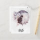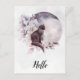 A hello postcard with a watercolor painting of a black cat and a light purple and pink floral bouquet. Standing in front a a large full moon. Stylish and magical.